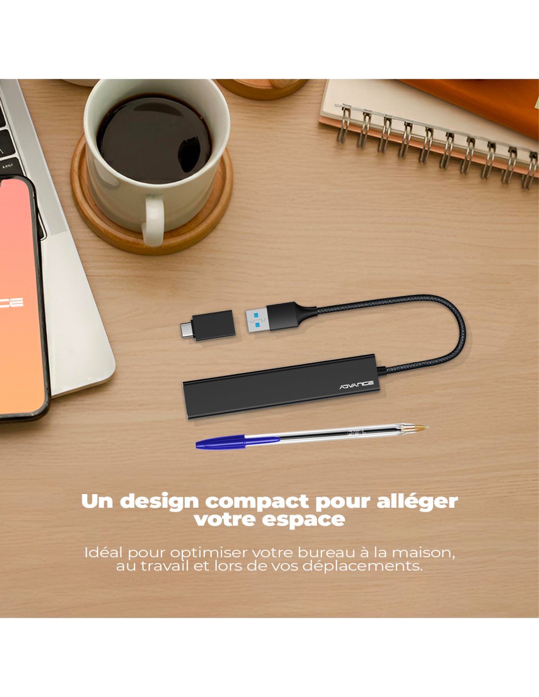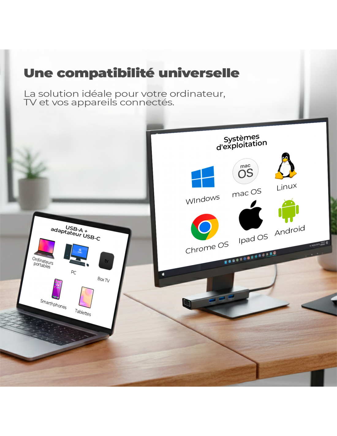 Un hub adapté à tous vos appareils : Doté d’un connecteur USB et livré avec un adaptateur USB-C inclus, XPAND SMART s’adapte à tous vos appareils. Il accompagne aussi bien les ordinateurs de dernière génération que les modèles plus classiques, vous permettant de passer d’un appareil à l’autre avec une parfaite fluidité. Un seul hub suffit pour centraliser et simplifier l’ensemble de vos connexions.