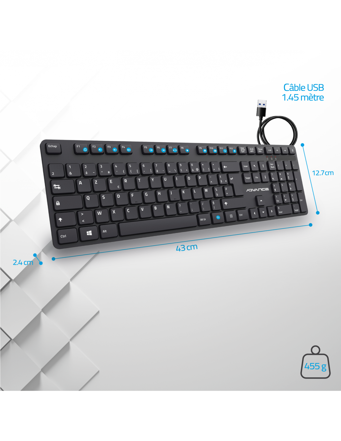 Designed to fit perfectly into your workspace. With a USB cable length of 1.45 meters, you benefit from maximum flexibility to position your keyboard according to your preferences. Its compact dimensions make it an ideal work companion, whether you're working at a desk, in a café, or on the go.