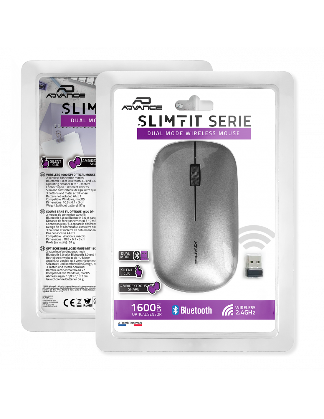 DOUBLE MODE ! La souris SlimFit propose 2 modes de connexion sans fil. Vous pouvez choisir la technologie Bluetooth 3.0 et 5.2 ou 2,4 GHz en branchant le nano récepteur USB à votre ordinateur. Vous pouvez même la connecter jusqu’à 3 appareils différents en Bluetooth.