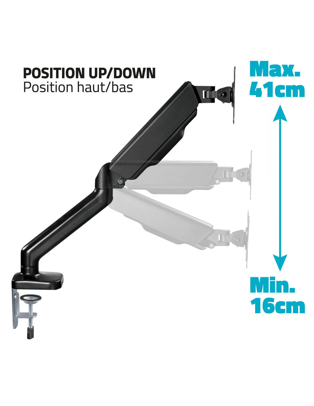9 KG PAR ECRAN : Bras articulé conçu avec un ressort à gaz permettant non seulement de supporter le poids de votre écran compris entre 2 kg et 9 kilogrammes mais aussi offrant une multitude de réglages : inclinaison, rotation, hauteur...