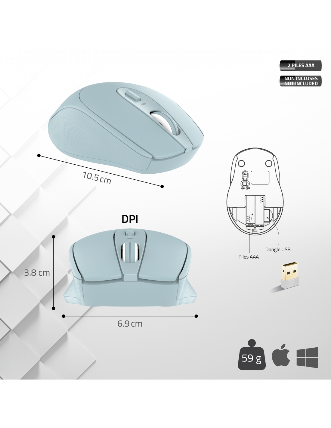 Pilhas AAA x 2 não inclusas - Dimensões